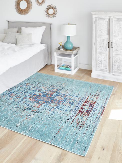 Taras w stylu boho z drewnianymi meblami, turkusowymi tekstyliami oraz białym pufem