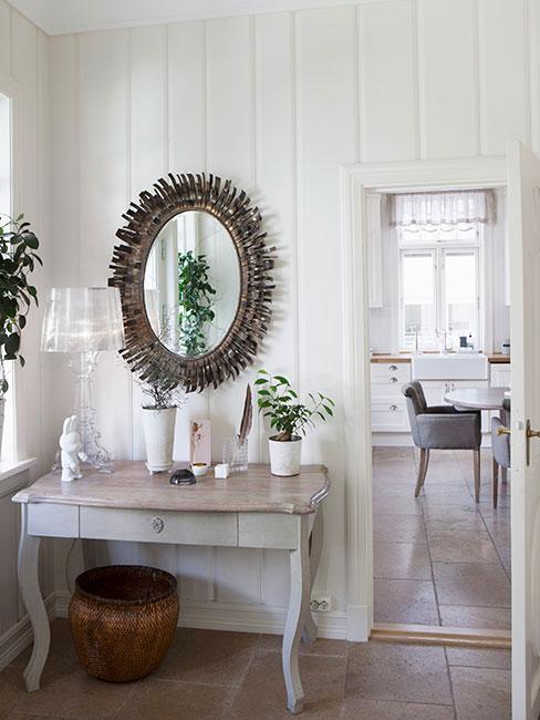 Jasny przedpokój w stylu skandynawskim, białe ściany i dywan