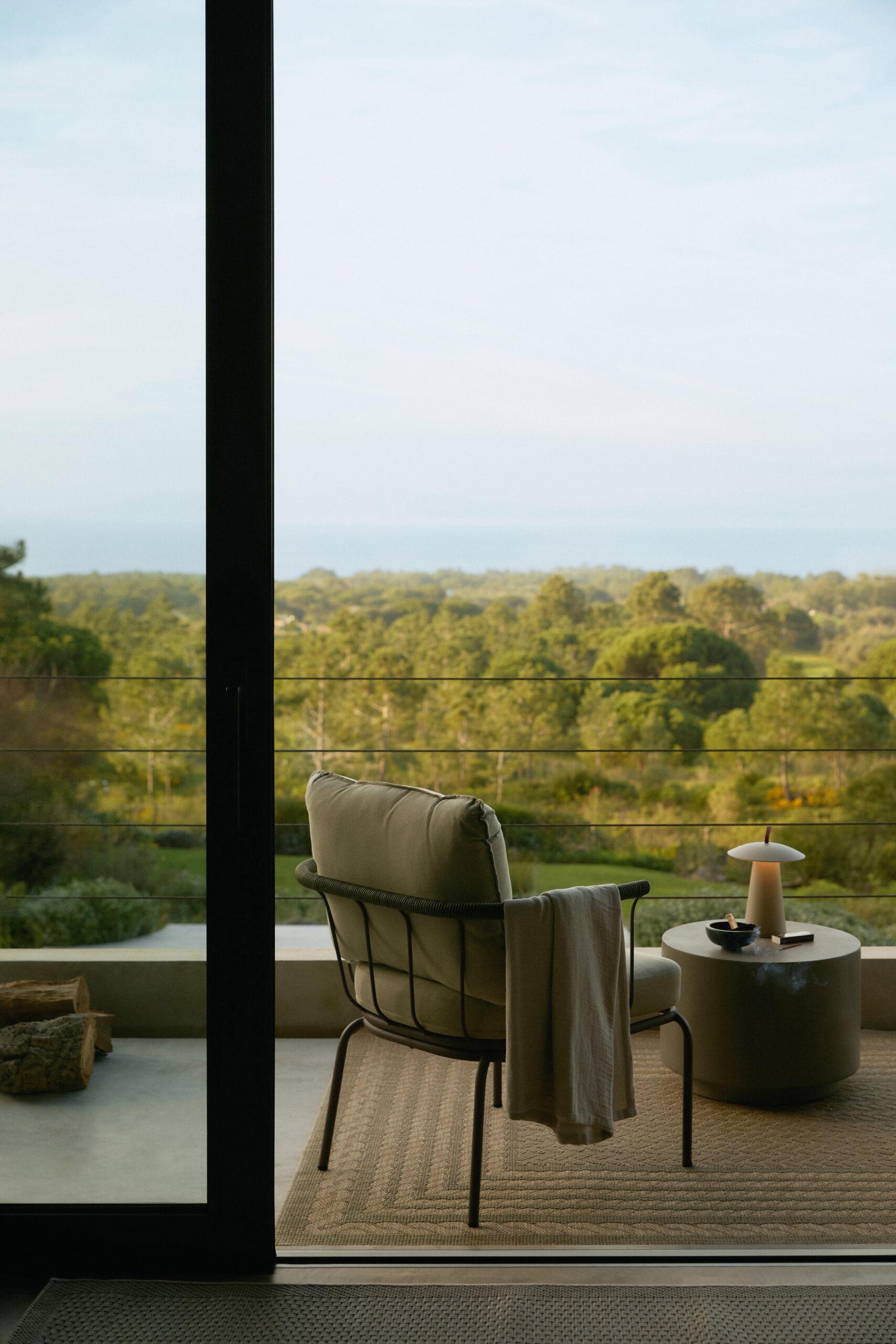 Loggia w stylu śródziemnomorskim w kształcie łuku z czarnymi meblami