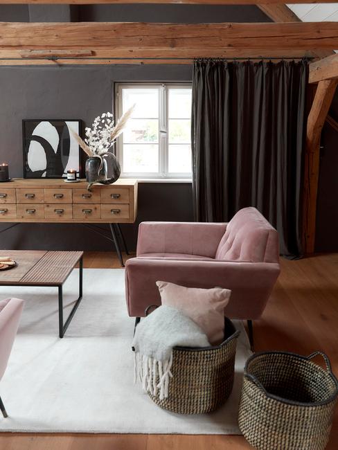 Szara sofa z różowymi poduszkami i różowym fotelem w salonie