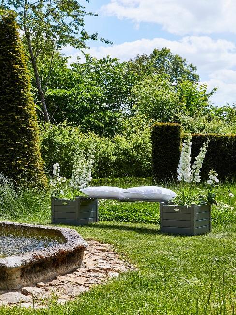 Zbliżenie na stolik z lampą solarną, wazonem oraz ławką w tyle z kocem