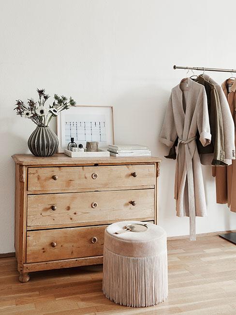 Fragment białej sypialni z boho, drewnianą komoda, lustem oraz rośliną na stoliku