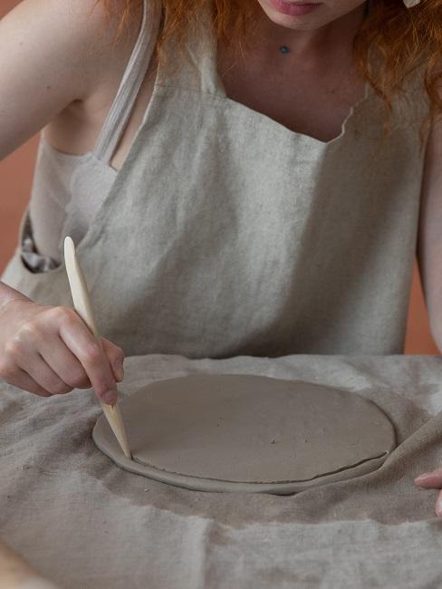 farmhouse: wzorzysta bezowa zastawa stołowa, białą dekoracyjną serwetką na drewnianym stole