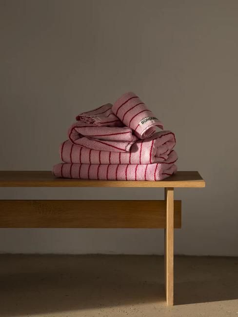 Zbliżenie na romantyczną łazienkę z białym stolkiem pomocniczym, na którym są różowe kwiaty w wazonie i świeczki
