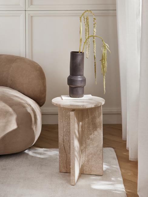 Stolik nocny z drewna z białą minimalistyczną lampą i wazonem z trawą pampas
