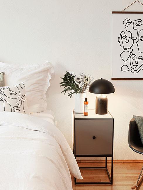 Fragment sypialni z czarną ławką, obrazem oraz białym dywanem w czarne kropki