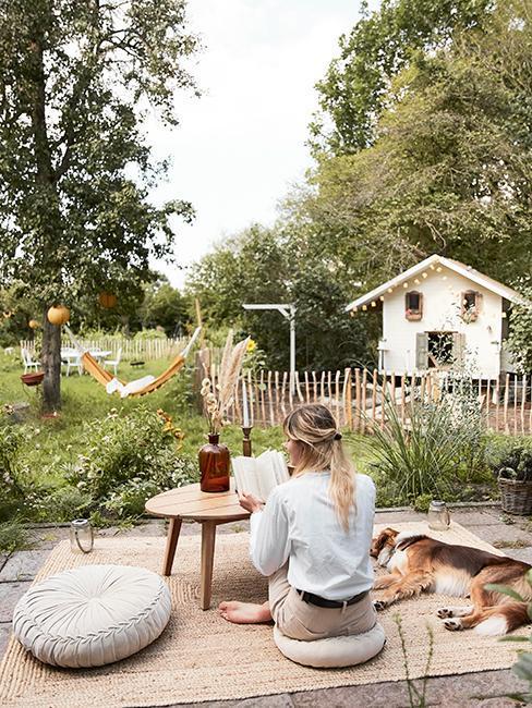 Słoneczny taras ze stołem drewnianym, ażurowymi meblami i lampami w stylu śródziemnomorskim