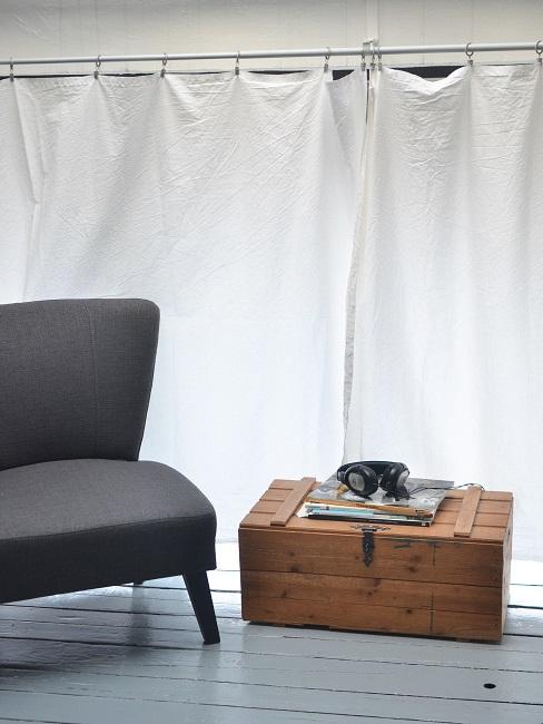 Zbliżenie na kącik wypoczynkowy z niebieskim fotelem z białą poduszką, niebieskim pufem przy wyjściu na balkon