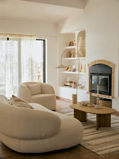 jasny pokój z minimalistycznym beżowym fotelem tapicerowanym i marmurowym stolikeim