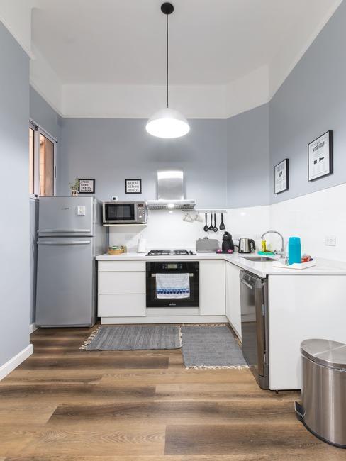 Kuchnia na poddaszu z jedną, pomalowaną ścianą na kolor oliwkowy