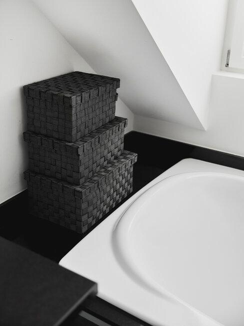 biało-szara wąska kuchnia z czarnymi akcesoriami