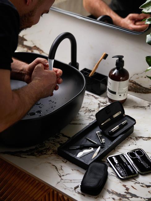 czarno biała łazienka z zielonymi akcentami