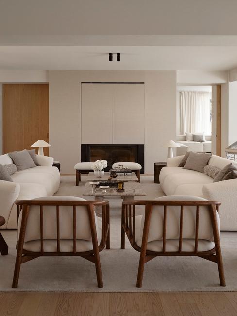 beżowy salon z drewnianymi meblami