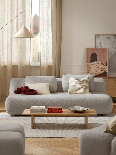 jasny nowoczesny pokój z jasną sofą narożną i ażurową lampą w kształcie kapelusza