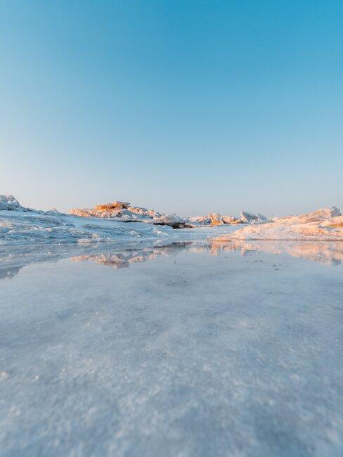 Choinka czerwono złota oprószona sztucznym śniegiem w jasnym rustykalnym salonie przy białym portalu kominkowym