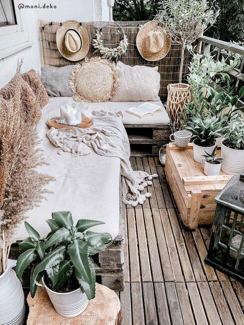 Drewniany taras z pufem, rattanowym krzesłem, drewnianym stolikiem, doniczkami z kwiatami