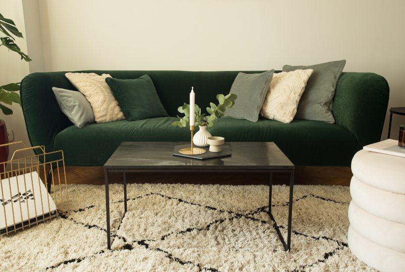 Pomysł na ścianę w salonie z welwetową sofą w kolorze terakoty