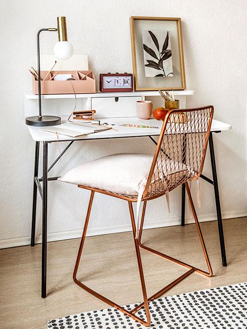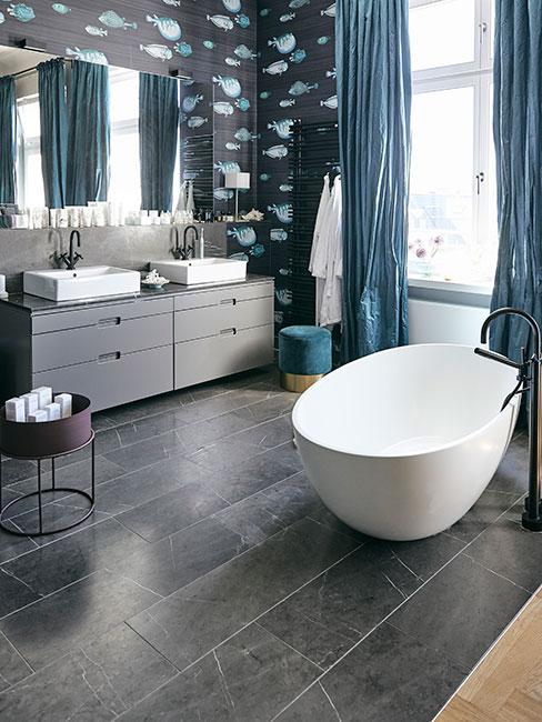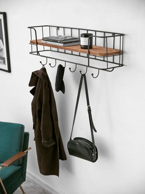 granatowa ściana na której wisi biała półka z granatowymi akcesoriami, pod nią białe krzesło i mała szafeczka w kolorze białym
