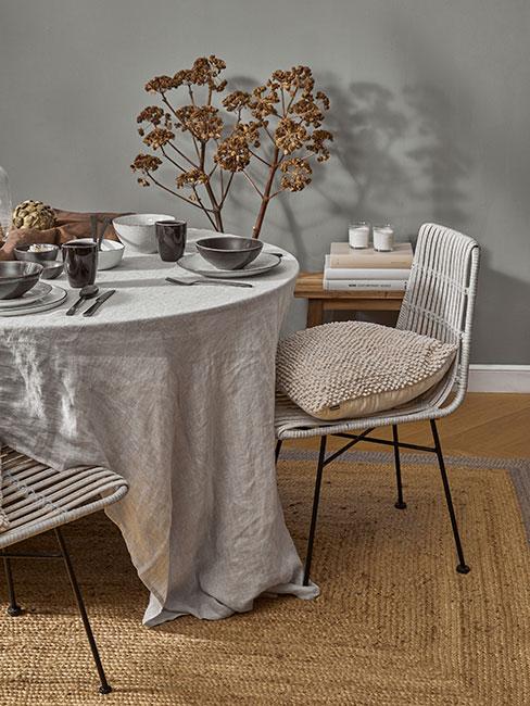 Zbliżenie na drewniany stół z czaernmi miseczkami, wazonem w jadalni