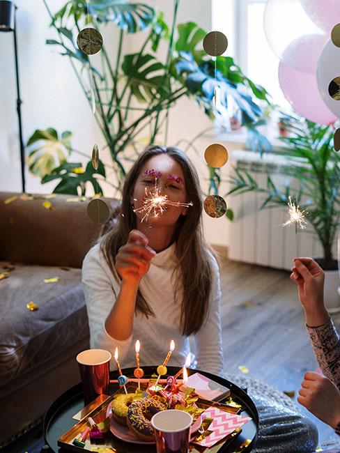 Mężczyzna wręczający bukiet róż na rocznice w salonie z czerwonymi balonami