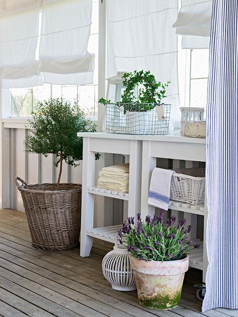 Balkon w sielskim stylu z drewnianymi meblami i lnianymi dodatkami
