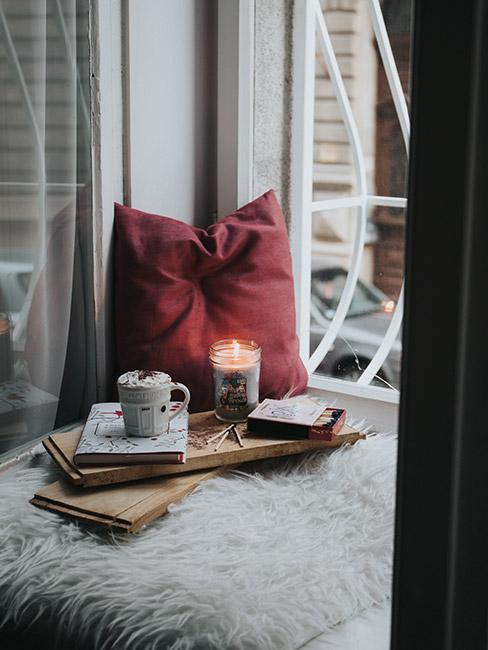 Drewiany stołek na którym leżą zwinięte , jasne ręczniki. W tle oko i szeroki parapet