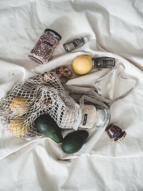 Kuchnia w kolorze seledynowym z białym regałem ściennym