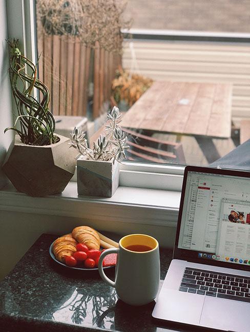 Sytlowa lampa z białym kloszem na srebrnej podstawie na parapecie