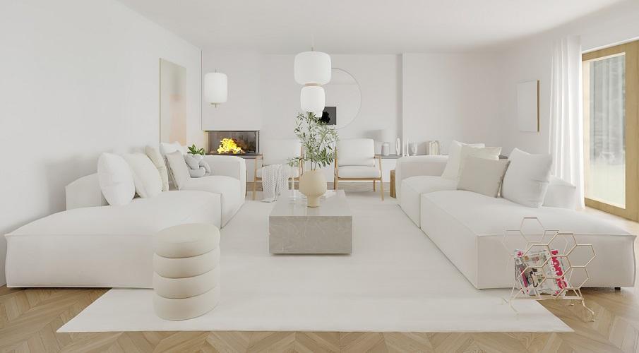 Biała aranżacja salonu w stylu glam.