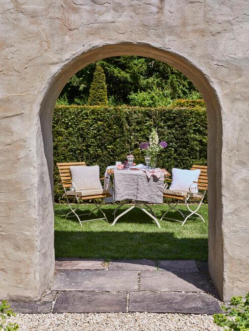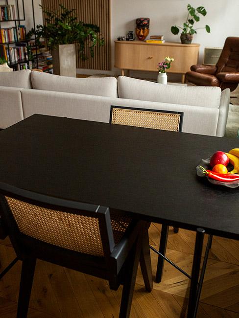 Mała jadalnia z drewnianym stołem, czarnymi krzesłami, drewnianym stołkiem oraz zastawą na stole