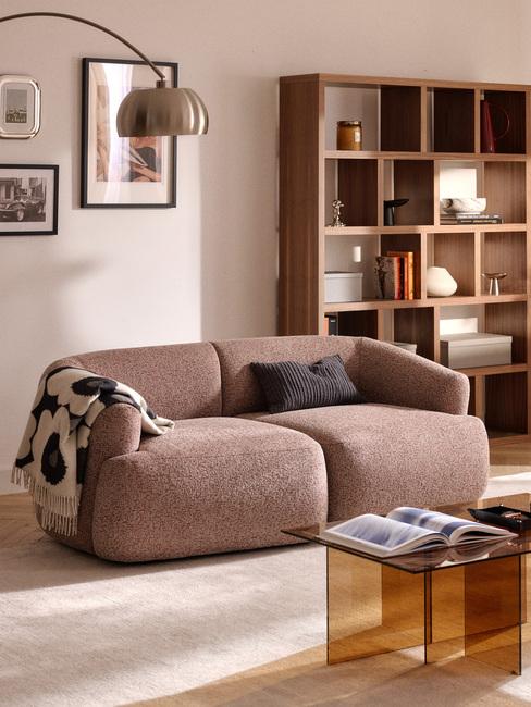 Sofa modułowa z terakoty w jasnym salonie z fotelami z plecionką wiedeńską z jasnego drewna
