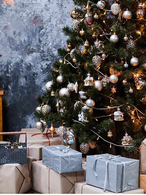 Zbliżenie na choinkę z ozdobami w kolorach ziemi na tle dużego okna oranżerii