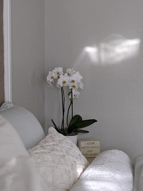 mała sypialnia z białą pościelą i meblami z naturalnego mebla i dywanem z juty
