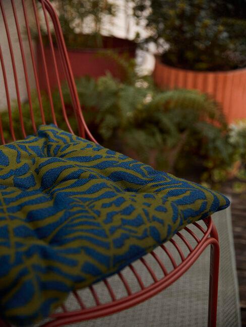 szary fotel z wikliny na tarasie obok taboretu z truskawkami