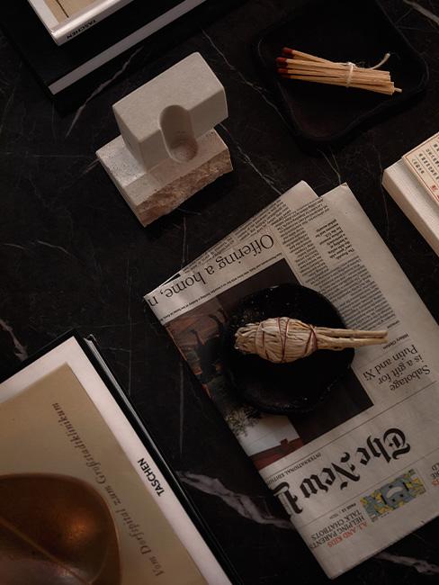 Czarna kamienna deska do krojenia na marmurowym blacie