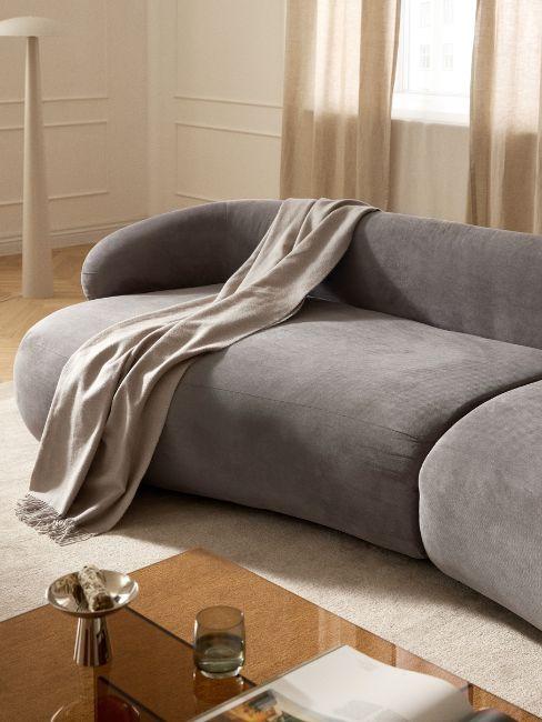Salon z szarą sofą z poduchami, marmurowym stolikiem i wyrazistym akcentem w postaci lampy