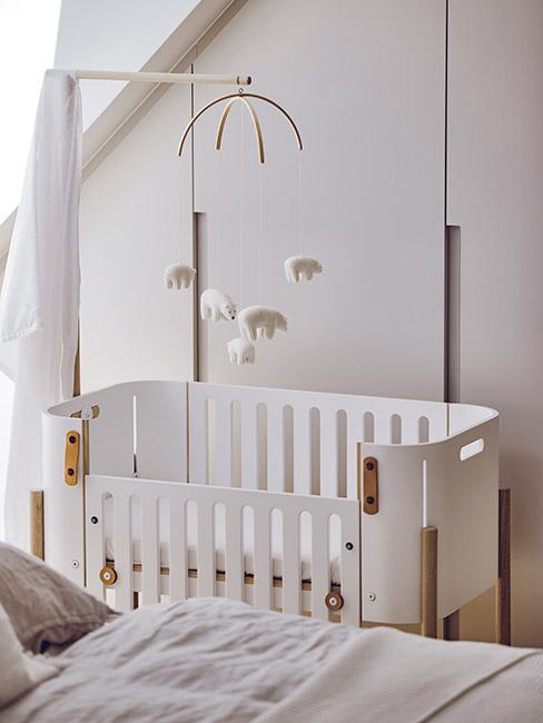 białe, metalowe łóżko w pokoju dziecięcym z drewnianym krzesłem i kilkoma lampami