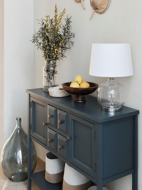 Salon z granatową ścianą, czarnym stołem i żółtymi dodatkami