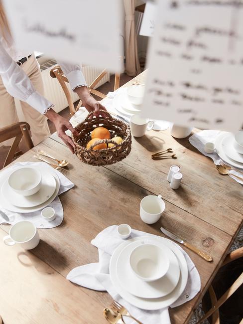 Stół przykryty ancracytowym obrusem, udekorowany gałązką świerku, zastawą Westwing oraz srerbnymi sztućcami