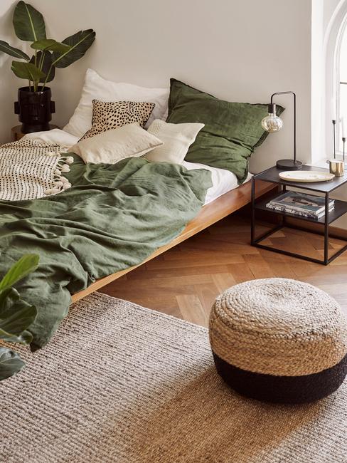 Aranżacja sypialni z falowanym zagłówkiem łóżka w szmaragdowych barwach