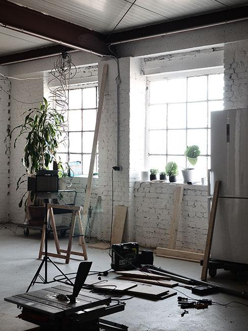 nowoczesny salon w stylu loft z szarą sofą