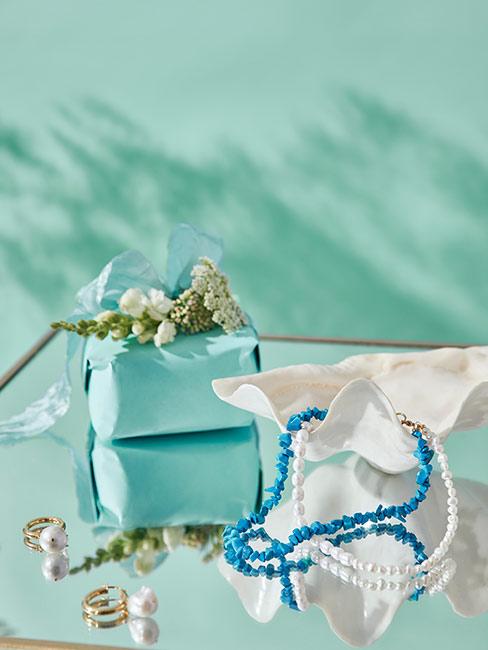 Oryginalne geometryzcne dekoracje z porcelany na tle jasnoniebieskiej ściany