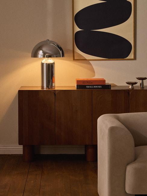 Biała komoda w stylu glam obok której stoją trzy okrągłe pudełka