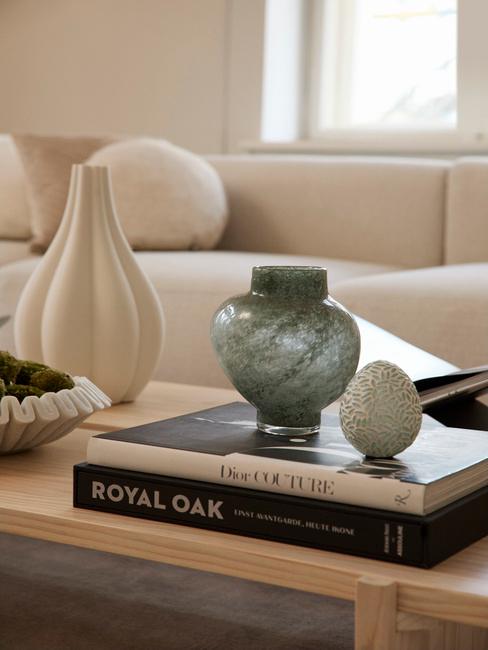 salon z minimalistycznymi drewnianymi meblami i tapetą w orientalne wzory