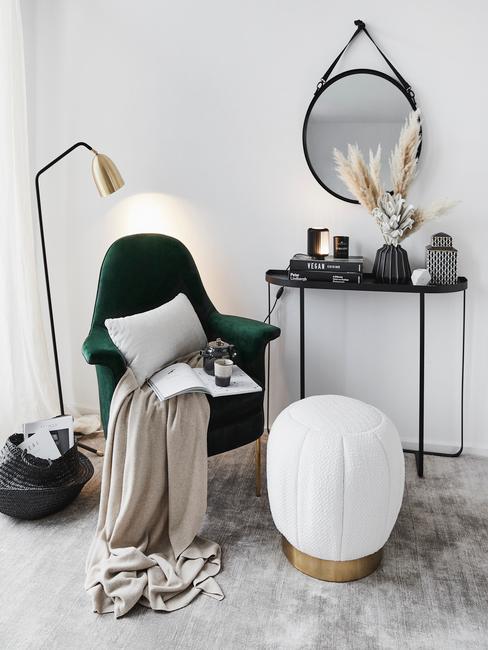 szary koc w sypialni z biała pościelą obok stolik kawowy w popielatym kolorze
