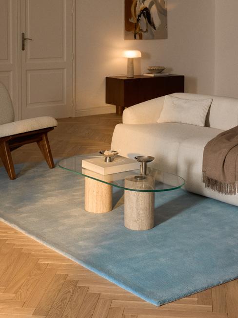 Minimalistyczna sypialnia z łożkiem, czarną lampą oraz marmurowym stolikiem
