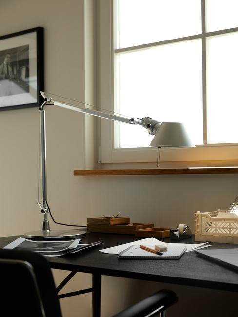 Metalowa ławka w kolorze taupe i biała lampka solarna