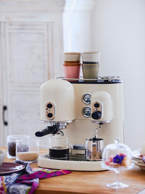 Kuchnia z meblami w jasnych kolorach, drewnianym stołem i dywanem w odcieniach brązu
