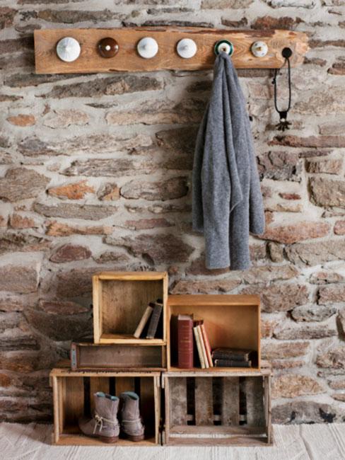 Fragment wnętrza w stylu rustykalnym, z drewnianym sekretarzykiem o fragmentem szarego, obitego krzesła