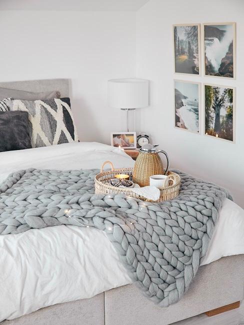 Łóżko z różowym, plecionym kocem, poduszkami, białą tacą z talerzykami z ciastem